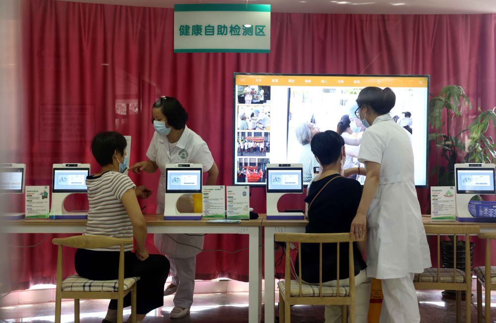 ↑8月3日,在合肥市瑶海区大兴镇社区卫生服务中心的健康小屋,社区医生在指导居民进行自我健康检测。