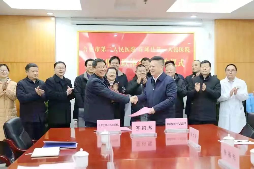 为贯彻国家医改精神,深化公立医院改革,促进优质医疗资源均衡布局,1月20日,合肥市第二人民医院院长储建军一行赴霍邱县第一人民医院参加医联体签约仪式。出席此次签约仪式的有霍邱县卫健委党组书记、主任梁瑞平,霍邱县医保局副局长李正葆,霍邱县第一人民医院党委副书记、院长郑新权及全体院领导班子成员。