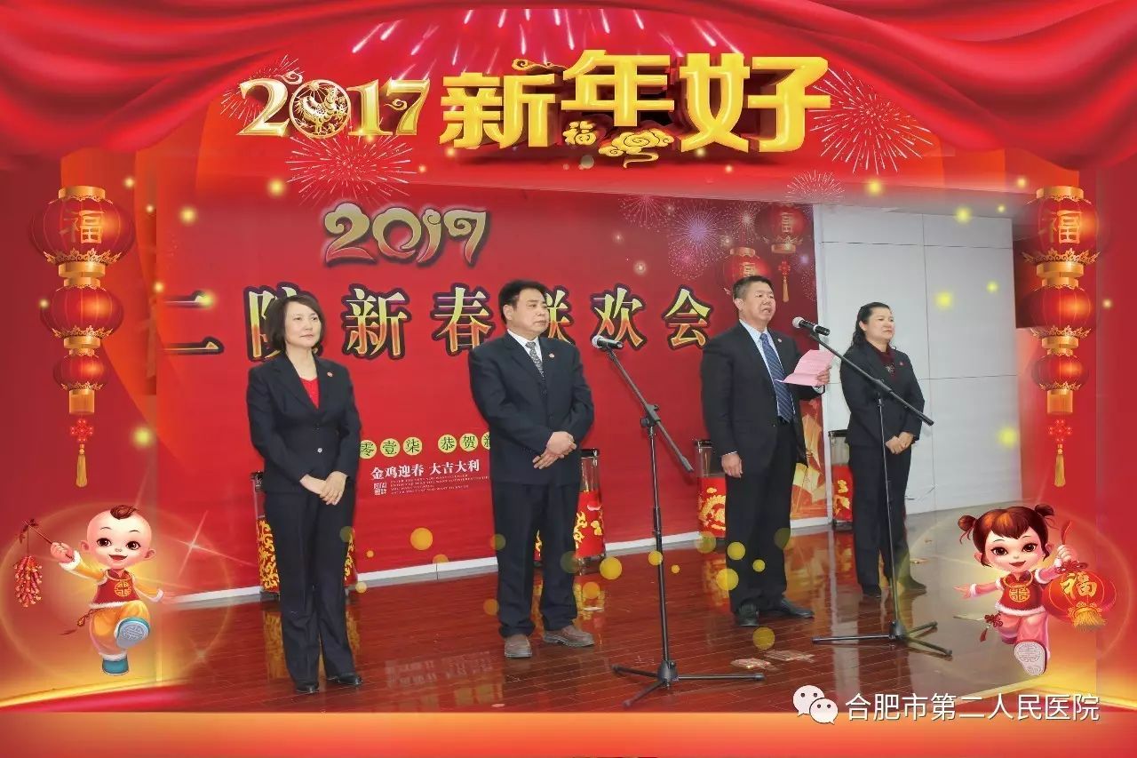 党委书记、院长李建中在联欢会上的新年贺词中说:“2016年,我们实现了”十三五“良好开局,荣获全国百姓放心示范医院、安徽省公共机构能源资源计量示范单位、合肥市卫生先进单位等称号。学科建设喜获突破,13个学科荣膺市重点学科;厚植爱心,优良文化得到广泛传承,在中国好人童春香、道德模范沈琼的带动下,又涌现了朱沛炎、周章萍、孙静翔等合肥好人。站在”五年规划“的时空交替点上,回顾2016,我们满怀喜悦和自豪,展望2017,我们满怀信心和憧憬,让我们撸起袖子加油干,为维护人民群众身体健康再做贡献。