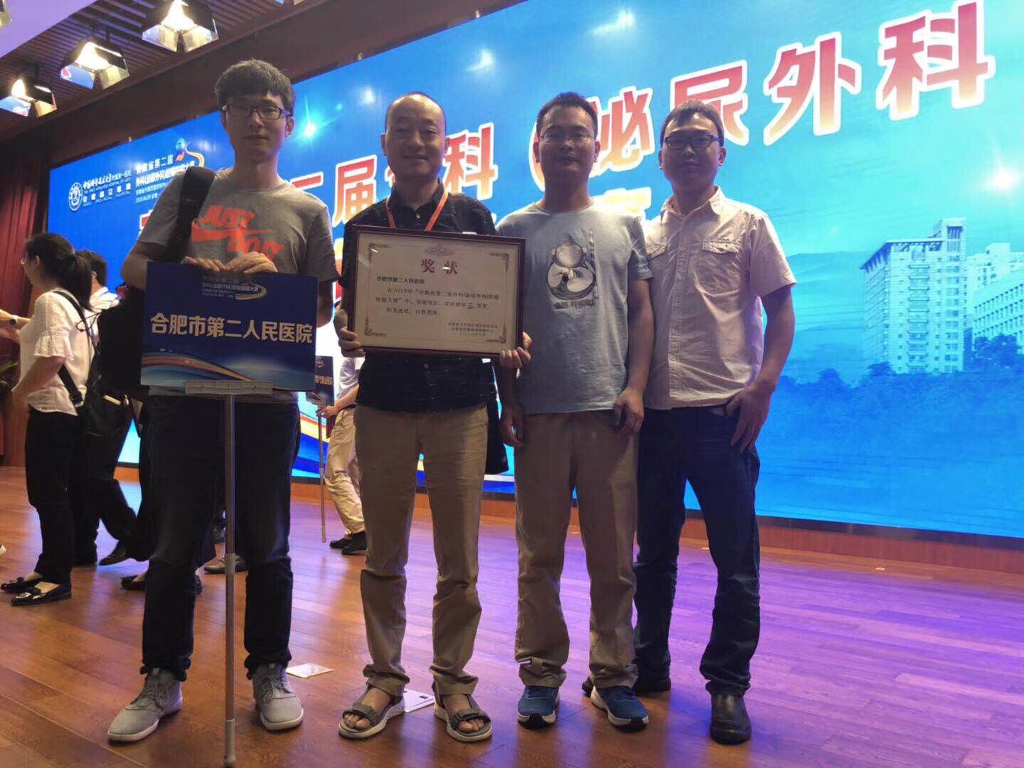 我院泌尿外科在张艳斌主任的带领下,派出由王伟副主任医师(领队)及吴畏、杨晓亮、席俊华三位主治医师组成的团队,经过激烈的角逐,顺利通过理论考试及腔镜技能初赛,进入12强闯入决赛。最终,在来自全省三级医院的数百名泌尿外科技术精英中脱颖而出,获得安徽省第二届泌尿外科腹腔镜技能大赛“团体三等奖”与单项奖“理论考试三等奖”的好成绩。